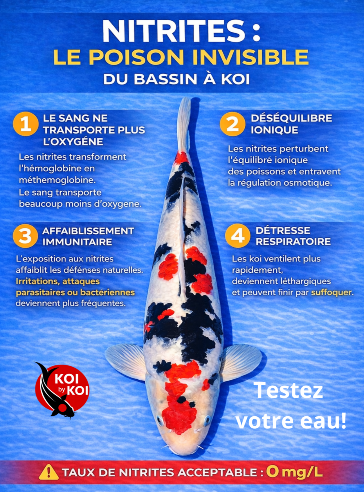Chez nos koi, les nitrites (NO₂⁻) provoquent une asphyxie fonctionnelle via la formation de Méthémoglobinémie (l’hémoglobine devient incapable de transporter l’oxygène). Mais leurs effets ne se limitent pas à ce mécanisme. Plusieurs impacts physiologiques secondaires existent.